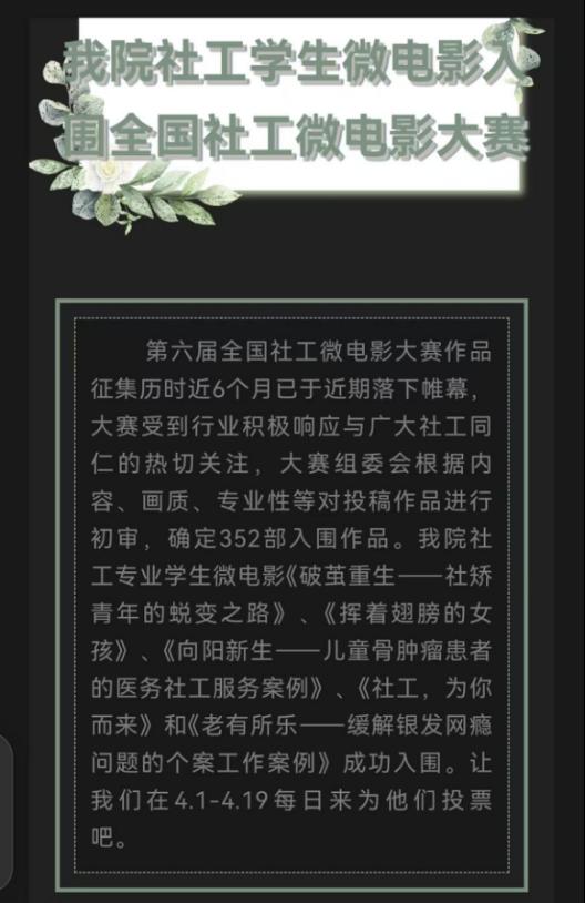 按照全国社工微电影大赛的比赛流程,经过了作品初审之后,公司5支团队全部入围,便通过官方微信公众号“东方社工人”开始网络投票。在社工协会的支持下,于2024年4月1日至4月19日进行全校范围的拉票。之后经历漫长的专家评审,2024年9月2日,社工微电影大赛入围名单正式发布,公司五只团队的作品获得提名奖。