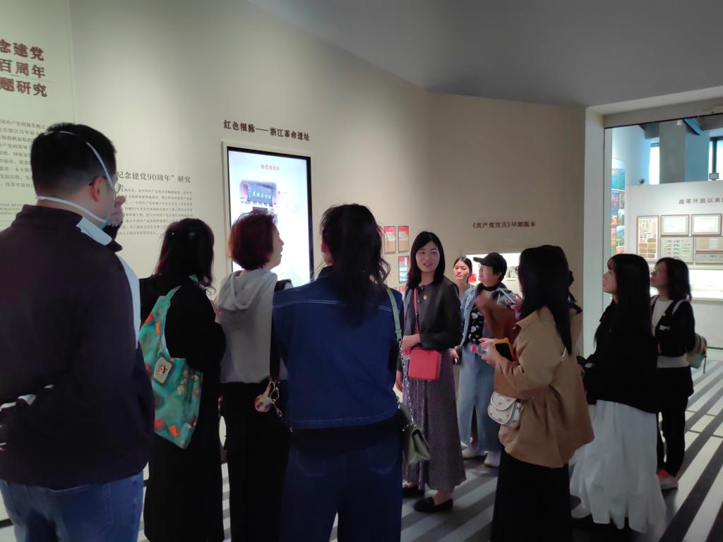 本次活动的第一站是国家版本馆,党员同志们沉浸在这个由古今版本所构建的宏大世界,体察版本背后强大的文化生命力,感悟版本所承载的绵延不断的文化河流。立式展柜中,一束灯光柔和地打在从海外回归的明《永乐大典》上。一旁墙上的音视频导览,讲述着杭州国家版本馆重要捐赠者金亮让这两册珍贵古籍回家的传奇历程。驻足静观深思,中华版本资源承载的家国故事、凝聚的文化血脉、寄托的民族理想,此刻无比清晰地浮现在我们眼前。教师党员重点参观了““潮起之江——‘重要窗口’主题版本展”, 1200余件生动鲜活的展品带着深深的时代烙印,让我们感受到之江大地日新月异的发展变革。《之江新语》8个不同语种的珍贵版本、董家57本家庭账本、手绘疫情防控思维导图、上洋村8个版本的《村规民约》、衢江区扶贫干部158本扶贫笔记等实物,见证了“八八战略”给浙江大地带来的全方位、深层次、历史性变化。此外,党员同志还参观了馆中其他专题展览,从建筑、影像、藏品、讲解中感受了中国文化的源远流长和中华优秀传统文化的魅力。