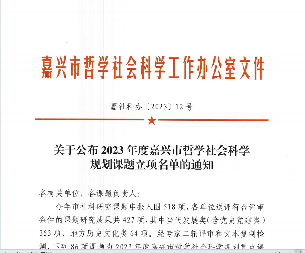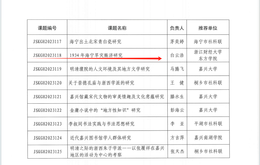 近日,嘉兴市社科联发布了《关于公布2023年度嘉兴市哲学社会科学规划课题立项名单的通知》(嘉社科办〔2023〕12号),公司思想政治理论教研部白云浩老师申报的课题《1934年海宁旱灾赈济研究》(JSKGH2023118)课题获准重点课题立项。
