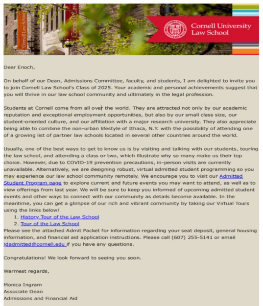 近日,公司2013级法学1班员工祝一诺被康奈尔大学录取为法律博士(JD)研究生,特此祝贺!