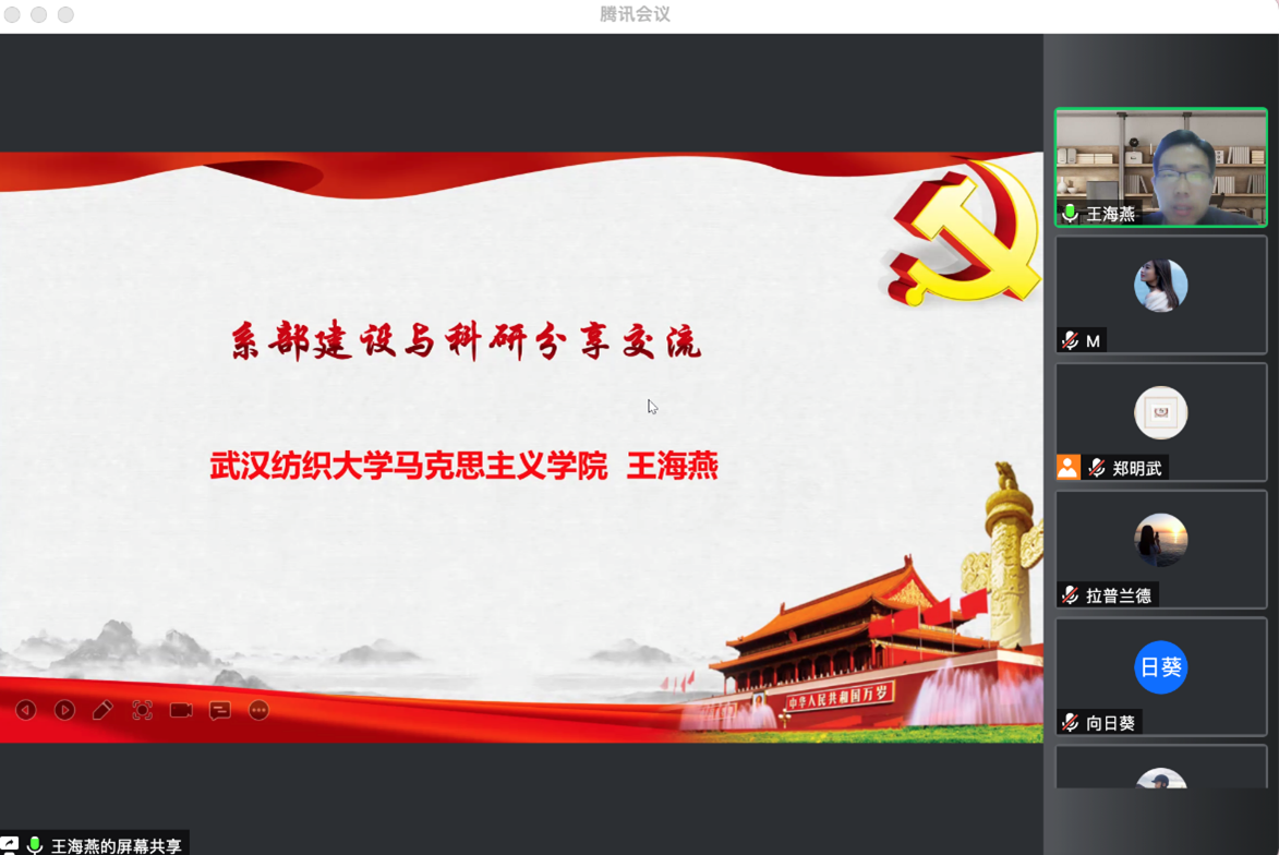 4月30日晚,公司思想政治理论课教研部以线上形式举行教研活动。本次教研活动邀请到武汉纺织大学马克思主义中国化教学部主任王海燕教授做题为“系部建设与科研分享交流”专题讲座。讲座由永利65335com副经理韩娟主持,永利65335com经理邵培樟、思想政治理论教研部全体教师参加。