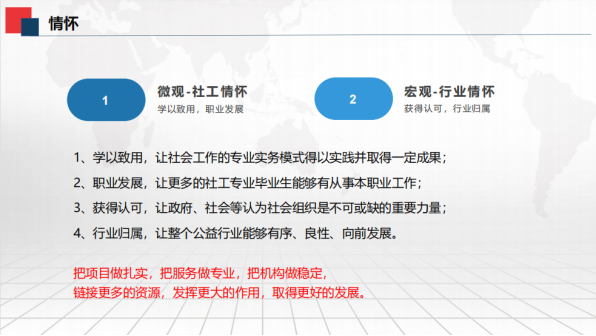 此次“社会服务领域创业”主题分享活动,不仅让同学们看到一个职业社会工作者和一个草根机构的成长过程,为今后自身成长提供借鉴;更是通过展示机构有效自洽的治理结构、丰富的服务产品增强同学们的职业认同感和信心。社会工作作为一个广阔的领域,大有可为。