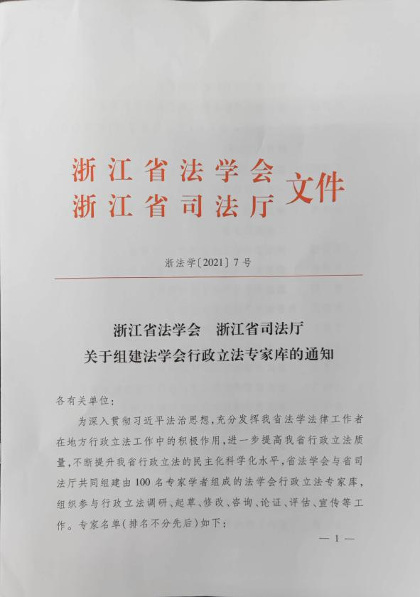近日,根据浙江省法学会、浙江省司法厅文件(浙法学[2021]7号),公司经理、院级智库社会治理与地方法治研究院经理邵培樟教授入选浙江省行政立法专家库。