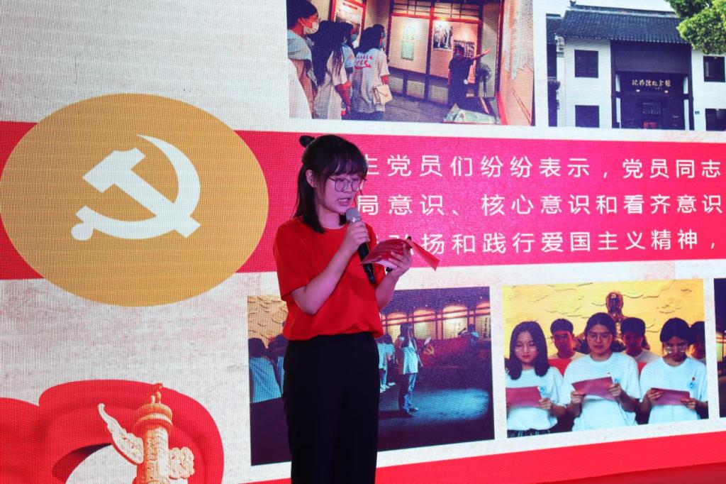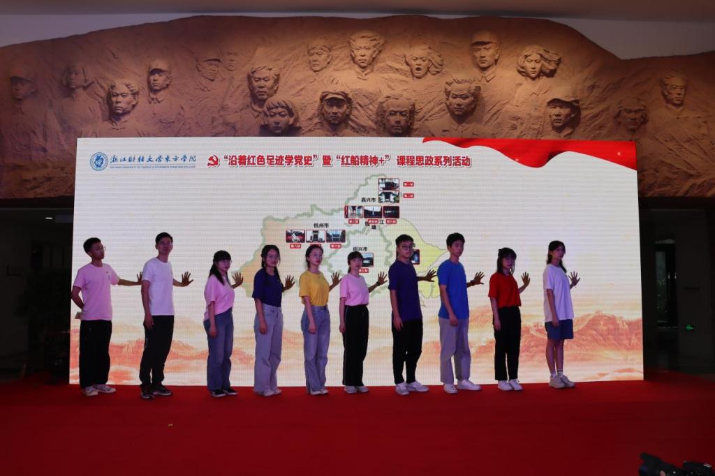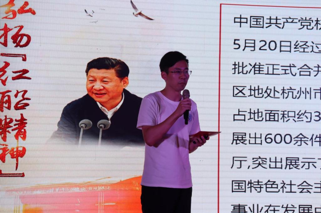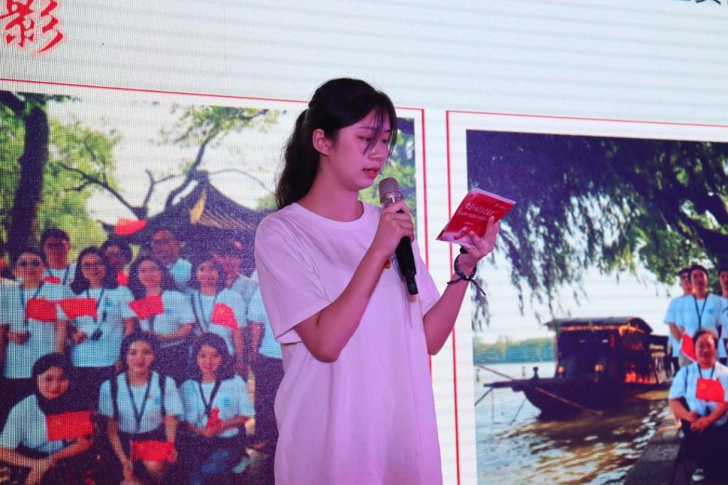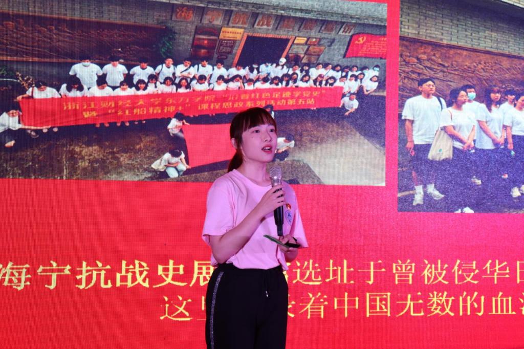 “沿着红色足迹学党史”暨“红船精神+”课程思政系列活动前后共赴十站,站站遍布风霜,站站满是荣光。第一站嘉兴南湖,财税公司党总支,宣讲人徐怡冉,她向我们讲述了“红船精神”,感悟那份非凡的初心和使命;第二站沈钧儒纪念馆,会计公司党总支,宣讲人叶轶欢,她向我们介绍了沈钧儒先生的个人介绍和青年员工党员的所思所想;第三站长安镇“红色记忆之路”国防教育基地,工商公司党总支陈泳豪,他向我们表达了坚定理想信念,传承红色基因的誓词;第四站海宁革命烈士纪念馆,联合党总支,宣讲人罗家栋,他向我们介绍了海宁革命烈士陵园纪念碑的结构,坚定了入党信念。第五站海宁抗战史展览馆,外国语公司党总支,宣讲人徐馨,她向我们讲述了侵华日军血染和叶村的故事,教育我们荷叶清清,挺傲骨而不折,出淤泥而洁净;第六站四明山抗日根据地旧址群,金融与经贸公司党总支,宣讲人柯雨佳,她向我们介绍了四明山抗日根据地的来源以及翁大花的故事;第七站绍兴市周恩来祖居及纪念馆,信息公司党总支,宣讲人王雪入,她向我们详细介绍了周恩来祖居和鲁迅故里;第八站杭州革命烈士纪念馆,文化传播与设计公司党总支,宣讲人宋洁茹,她让我们体会到了如今幸福生活来之不易,懂得了生命真正的意义,也懂得了自己身上所肩负的责任。第九站中国共产党杭州历史馆、五四宪法馆,他带我们重温了杭州人民在中国共产党的领导下为争取国家独立和民族解放的艰辛;第十站,浙江革命烈士纪念馆,公司党总支,宣讲人罗今,他向我们讲述了自己爷爷奶奶的故事,让我们铭记学习他们的无畏精神,方寸之间,荣光始现。最后,十位宣讲人一起,将手置于红色地图之上,点燃红色地图。