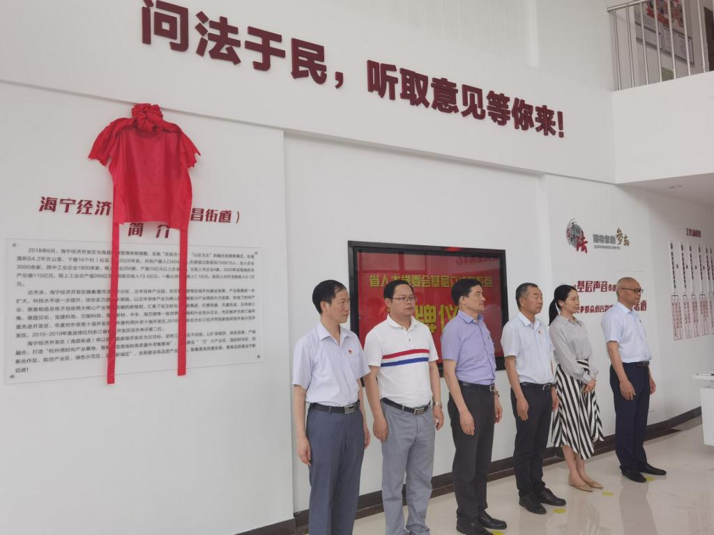 省人大法制委主任委员丁祖年与海宁市人大常委会主任姚敏忠等一起为“省人大常委会基层立法联系点”揭牌。