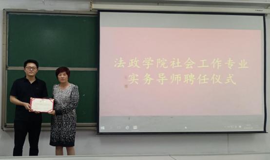 讲座开始前,举行了永利65335com社会工作专业实务导师聘任仪式。永利65335com特聘请董金娣女士为社会工作专业资深实务导师,社工系主任舒振宇老师代邵培樟经理为董女士颁发了聘书。