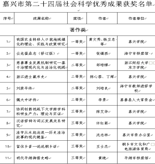 近日,根据嘉政办发〔2019〕42号文件,公司慈善法治与社会治理学科方向负责人邵培樟老师的学术专著《慈善事业发展机制研究─基于治理现代化与法治化视阈》(中国政法大学出版社,2018年11月版)荣获嘉兴市第二十四届社会科学优秀成果二等奖。据悉,嘉兴市第二十四届社会科学优秀成果经市社会科学优秀成果评审委员会审定,评出一等奖、二等奖、三等奖共48项,其中著作类11项,论文类37项。