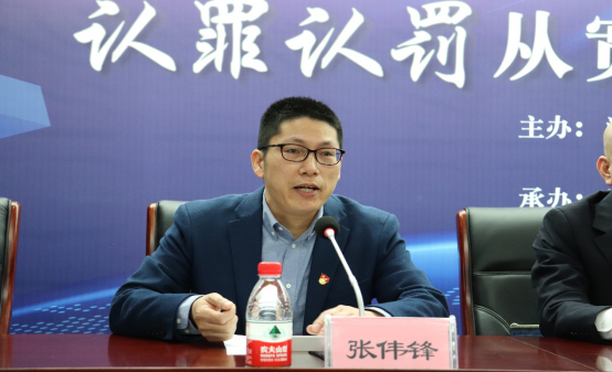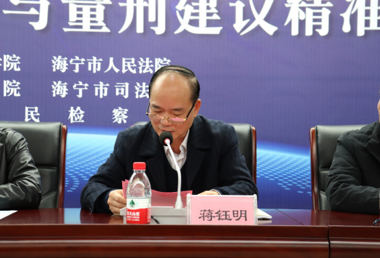 海宁市司法局局长张伟锋致辞,他以近两年海宁市刑事案件为切入点,通过分析认罪认罚从宽制度的实际应用情况,得出该项制度的落实不仅帮助了犯罪嫌疑人,还大大节约司法资源,促进了司法资源高效利用的结论。同时,他认为通过学术讲座案例分析,可以多方学术交流、共同探讨,且能够正确理解和把握认罪认罚从宽制度和量刑建议精准化,从而发挥集体智慧,进一步提升法学实务理论研究,加大司法机关的司法实践力度。