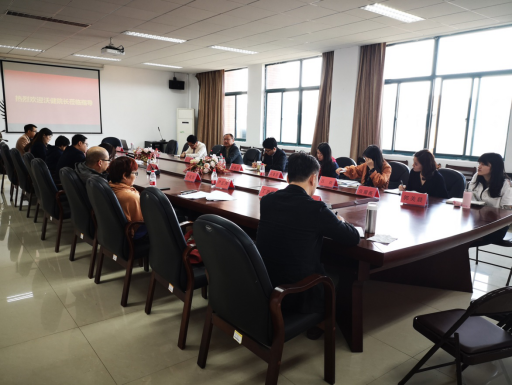 法政分院经理邵培樟代表分院向沃健经理做工作汇报。邵经理从办院理念与发展规划、主要工作与主要成绩、主要不足与主要困难三个方面全面系统地汇报了法政分院2016年—2019年的工作情况,他指出法政分院这届领导班子根据“制度治院、教学立院、科研兴院、员工荣院”的办院理念,团结和依靠全体教师在完善分院治理结构、加强团队队伍建设、扎实推进专业建设、启动学科方向建设、不断深化社会服务、致力红色文化传承等方面取得了一定的成绩,但在高层次团队、双师双能型团队的应用能力以及标志性的教学科研成果等方面仍然存在着不足。