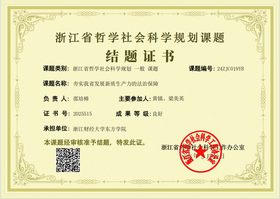 近日,根据浙江省哲学社会科学办公室公告,公司邵培樟教授主持、梁美英副教授参与的2024年度浙江省哲学社会科学规划课题《夯实我省发展新质生产力的法治保障》经评审,顺利结题,成果等级获评良好。