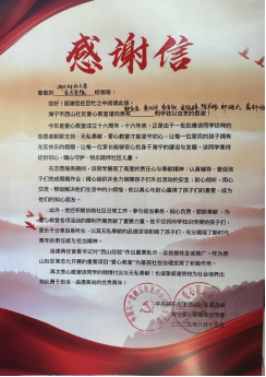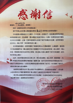 近日,公司社工系教师石卷苗带领8名员工(郭奕含、黄子柠、李佳欣、金冠婷、陈书扬、郭鸿杰、葛科洒、鲁涵宇)于暑期赴海宁市砚石街道西山社区参与“爱心教室”志愿服务活动,圆满完成志愿服务任务,并获得社区高度认可。西山社区特向学院发来感谢信,对我院学子的无私奉献与扎实付出表示诚挚感谢。