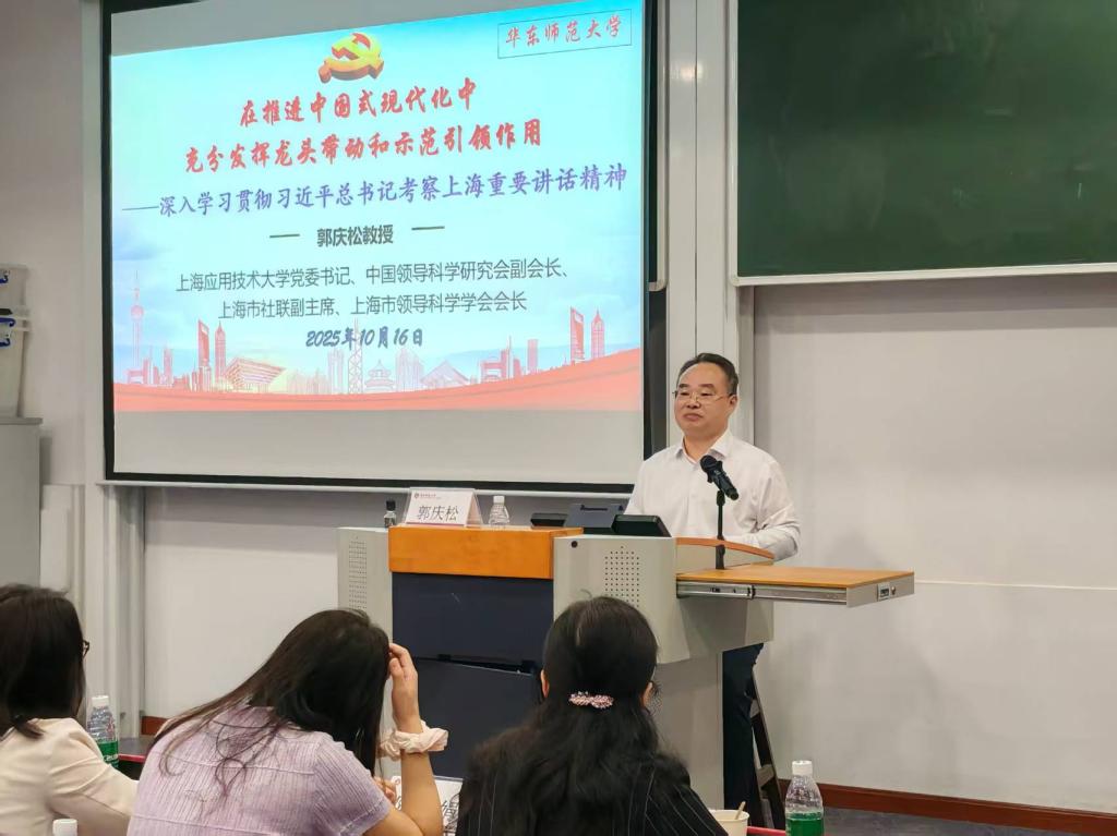 此外,上海应用技术大学党委书记郭庆松教授,作了“习近平总书记考察上海重要讲话精神解读”的辅导报告。郭书记详细阐述了习近平总书记重要讲话的战略意义,鼓励教师们深刻领会新定位、新论断、新要求、新任务,汲取前行动力,增强突破难关的智慧,以高度的自觉性和行动力,投身于思政课教学中。