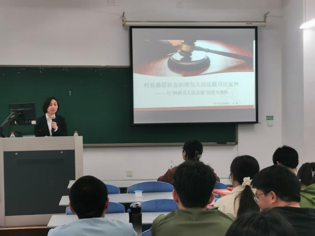 讲座伊始,邵培樟教授向同学们抛出了“人民法院(庭)的法律属性与法定职能什么?”“社会治理体系中是否有人民法院(庭)的位置?”“人民法院(庭)为何以及如何参与基层社会治理”三个问题。讲座中,金逸庭长阐述了人民法庭的法定职能以及在基层社会治理中的职能定位,认为新时代“枫桥经验”是基层社会内在的且被实践证明有效的治理方法,她提出了人民法庭参与村社基层社会治理的实践路径和具体举措,并通过结合现实案例,让同学们了解到更多相关法律知识,进一步解读了正在形成的“诉讼社会”概念。