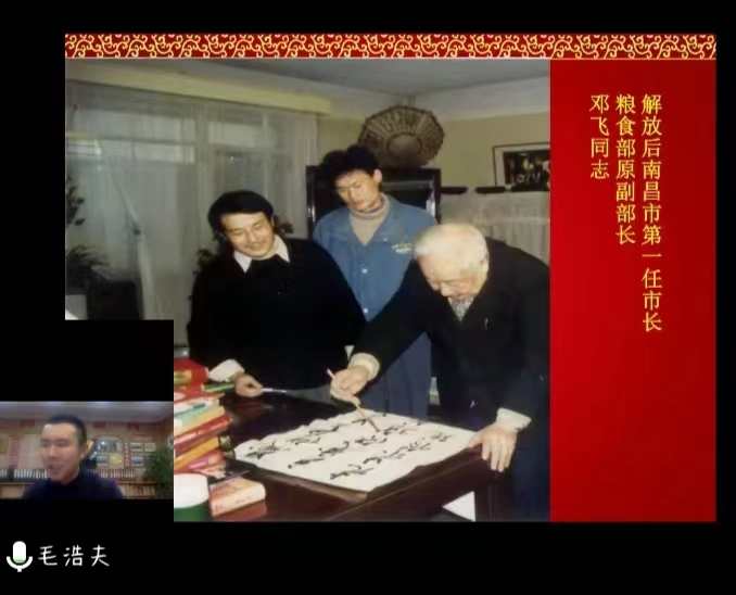在报告中,毛浩夫指出,百年光辉历史不止存在于革命博物馆、革命传记,也存在烈士陵园。他通过家中珍藏的一张张老照片来讲述一位位革命烈士与江西的故事,毛浩夫强调,井冈山精神在新时代同样具有巨大的学习价值,江西是一片充满红色记忆的土地,红色基因早已融入了城市血脉,这些为革命前仆后继的革命人,拉开了革命走向胜利的序幕,是理想信念的光辉凝聚。百年征程波澜壮阔,百年初心历久弥新,革命先人的精神风貌值得我们赞叹,更值得我们学习,革命先烈的爱国热情激励我们新时代的青年在中国现代化实现两个百年目标而奋斗。