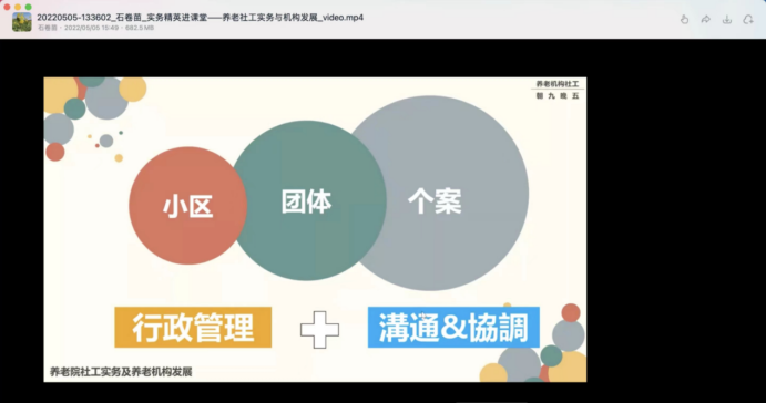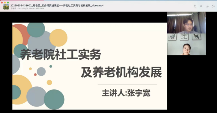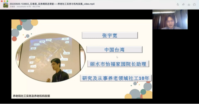 为切实提高员工老年社工实务能力培养,5月5日下午,社会工作系特别邀请了丽水市怡福家园经理助理、丽水养老机构绩效评估组专家张宇宽先生为21社工C1班社工专业员工就“养老社工实务与养老机构发展”进行实务经验分享与交流。考虑到疫情防护情况,此次“实务精英进课堂”以线上方式进行。