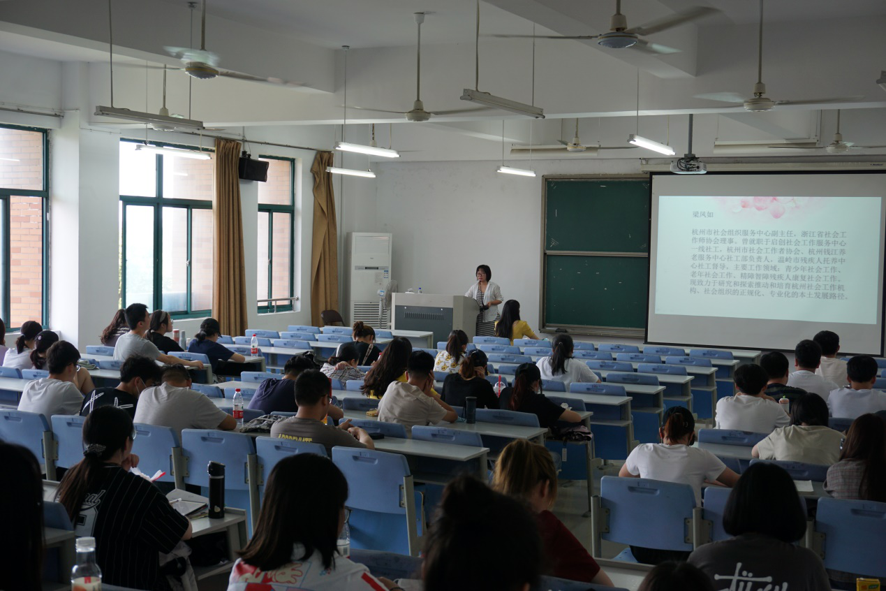 为响应“四位一体协同育人”的专业人才培养模式,推进公司实践教学改革,提高人才培养质量,社会工作专业结合《社区工作》课程要求于6月2日举办“实务精英进课堂”活动。讲座由杭州市社会组织服务中心副主任梁凤如主讲,郭美晨老师主持,法政公司2018级全体社会工作专业员工参加。