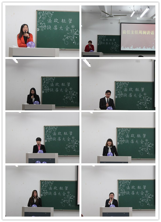 在主持人幽默风趣的语言带领下,换届大会正式开始。吕欢老师首先预祝了各个岗位的新的任职人员顺利接棒和换届大会的成功举办,在肯定了社管新老成员们的努力的同时,也对未来的社管能更加蓬勃生气表达了诚挚的期许,提出了今后要加强法政社管微信、微博等新媒体宣传的力度,相信在老师的大力支持和社管人的共同努力下,社管会大放异彩,蓬勃向上。